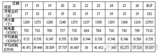 前后相比,10天供水量幾乎相等,而耗電減少1720KWH,平均單耗降低0.136KWH,節(jié)電率24.37%,平均時耗降低9.942KW/H,節(jié)電率25.37%,平均節(jié)電率達(dá)24.87%,節(jié)電效果顯著。