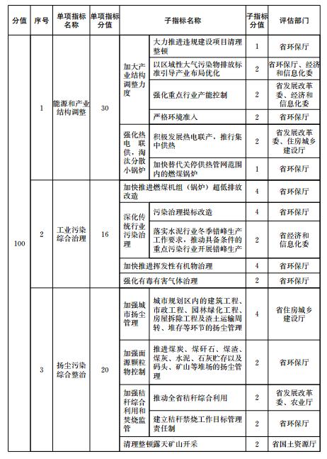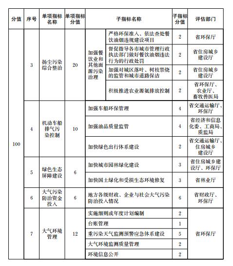 大氣污染防治重點(diǎn)任務(wù)完成情況包括能源和產(chǎn)業(yè)結(jié)構(gòu)調(diào)整、工業(yè)污染綜合治理、揚(yáng)塵污染綜合整治、機(jī)動(dòng)車船排氣污染控制、綠色生態(tài)屏障建設(shè)、大氣污染防治資金投入、大氣環(huán)境管理等7項(xiàng)指標(biāo)。大氣污染防治重點(diǎn)任務(wù)完成情況各指標(biāo)的定義、評(píng)估要求和計(jì)分方法等由有關(guān)評(píng)估部門(mén)按照《二期行動(dòng)計(jì)劃》的職責(zé)分工確定,評(píng)估部門(mén)根據(jù)子指標(biāo)分值對(duì)各市重點(diǎn)任務(wù)進(jìn)行打分,并向省環(huán)保廳提供評(píng)分結(jié)果。評(píng)估部門(mén)為兩個(gè)部門(mén)以上的,各評(píng)估部門(mén)分別打分后取平均值作為本項(xiàng)重點(diǎn)任務(wù)得分。