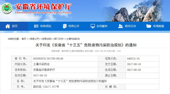 關(guān)于安徽省“十三五”危險廢物污染防治的具體要求