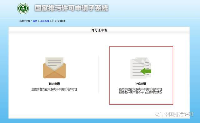正確的操作是——進(jìn)入“國(guó)家排污許可證信息公開(kāi)系統(tǒng)”的“申請(qǐng)子系統(tǒng)”(http://permit.mep.gov.cn/permitExt/outside/LicenseRedirect),進(jìn)行“補(bǔ)充申請(qǐng)”。