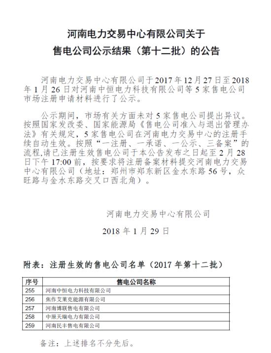 新聞中心日前,河南電力交易中心發(fā)布了關(guān)于售電公司公示結(jié)果(第十二批)的公告,公告中稱,于2017年12月27日至2018年1月26日對(duì)河南中恒電力科技有限公司等5家售電公司注冊(cè)申請(qǐng)材料進(jìn)行了公示,未收到異議,注冊(cè)手續(xù)自動(dòng)生效。