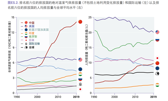 可以看出來,就排放總量而言,2019年中國已經遠遠的超過了其他國家,甚至已經是美國的2倍了,中國的碳排放差不多140億噸二氧化碳當量,