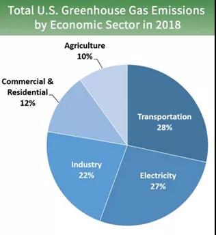 看美國2018年的數據也是類似的,交通(28%),發電(27%),工業(22%),建筑(12%)