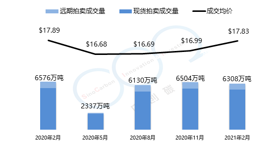加州-魁北克碳市場的初始配額發放以拍賣為主,每個季度舉行一次拍賣。2021年2月拍賣均價為17.83美元,較上一季度漲幅為5%,總成交量為6308萬噸。以下是由中創碳投統計的加州-魁北克碳市場近一年的交易情況。