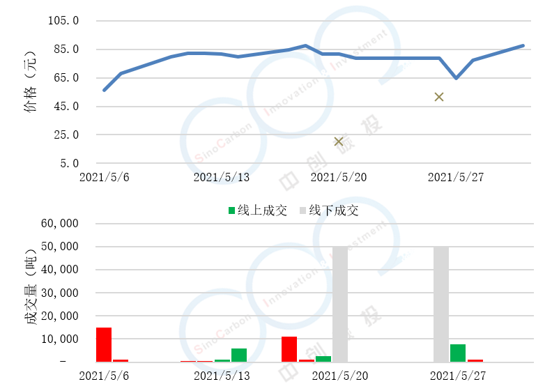 - 線(xiàn)上最低成交價(jià)為56.47元,最高為87.50元,平均碳價(jià)為71.00元。