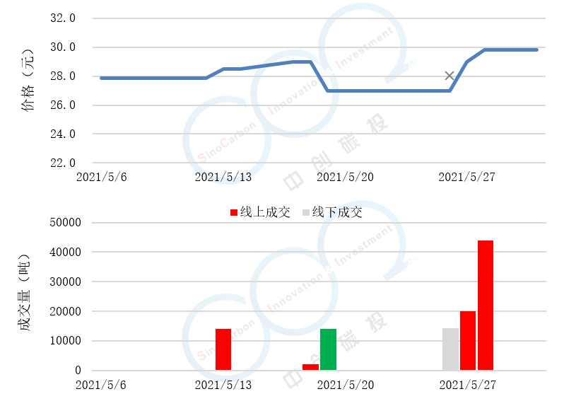 - 線(xiàn)上成交價(jià)最低為27.00元,最高為29.80元,平均碳價(jià)為29.00元。