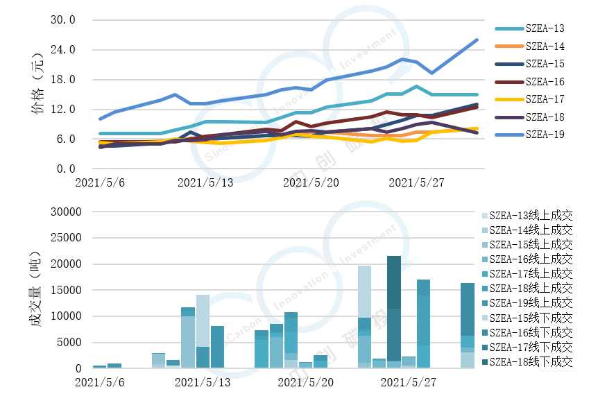 - 線(xiàn)上成交價(jià)最低為4.39(產(chǎn)品SZEA-18),最高為25.99元(產(chǎn)品SZEA-19),平均碳價(jià)為10.08元(平均碳價(jià)為各產(chǎn)品價(jià)格加權(quán)得出)。