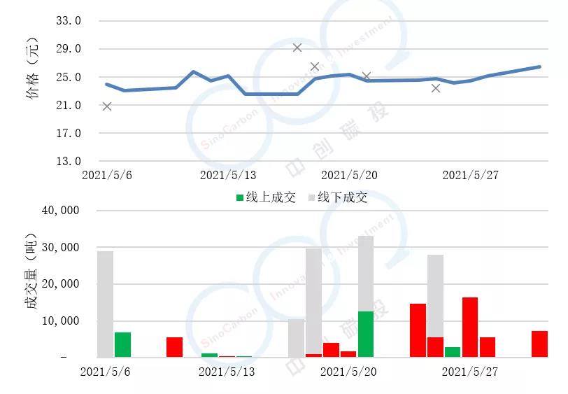 - 線(xiàn)上成交價(jià)最低為22.60元,最高為26.50元,平均碳價(jià)為24.47元。