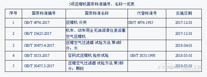 2017年第11號、第23號、第29號中華人民共和國國家標(biāo)準(zhǔn)公告,由國家質(zhì)量監(jiān)督檢驗檢疫總局、國家標(biāo)準(zhǔn)化管理委員會批準(zhǔn)發(fā)布了共5項壓縮機國家標(biāo)準(zhǔn),具體內(nèi)容見表: