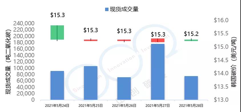 2021年5月24日至5月28日,本周韓國碳價延續(xù)上周的下跌趨勢,由15.3美元/噸下跌至15.2美元/噸。本周韓國碳市場成交量達到52萬噸,遠高于上周7萬噸的水平。