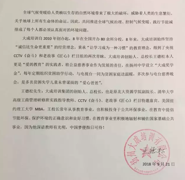 ?大成培訓(xùn)自2010年創(chuàng)辦起,至今在全國開辦80余所分校,8年來,大成培訓(xùn)始終堅持“誠信比生命更重要”的經(jīng)營理念,秉承“讓學(xué)習(xí)成為一種習(xí)慣”的教育理念,得到了央視CCTV《奮斗》和老故事《匠心》欄目組的兩次青睞。大成培訓(xùn)創(chuàng)始人、總校長王德松本人更是“愛的教育”的實踐者,將公益慈善事業(yè)作為發(fā)展的責任,在揚州中學(xué)設(shè)立“大成獎學(xué)金”,8年從不間斷。每年定期組織貧困助學(xué)行動,多次參與電臺慈善晚會,與電視臺一同為貧困家庭送溫暖,是多名貧困失學(xué)兒童未曾謀面的“愛心爸爸”。